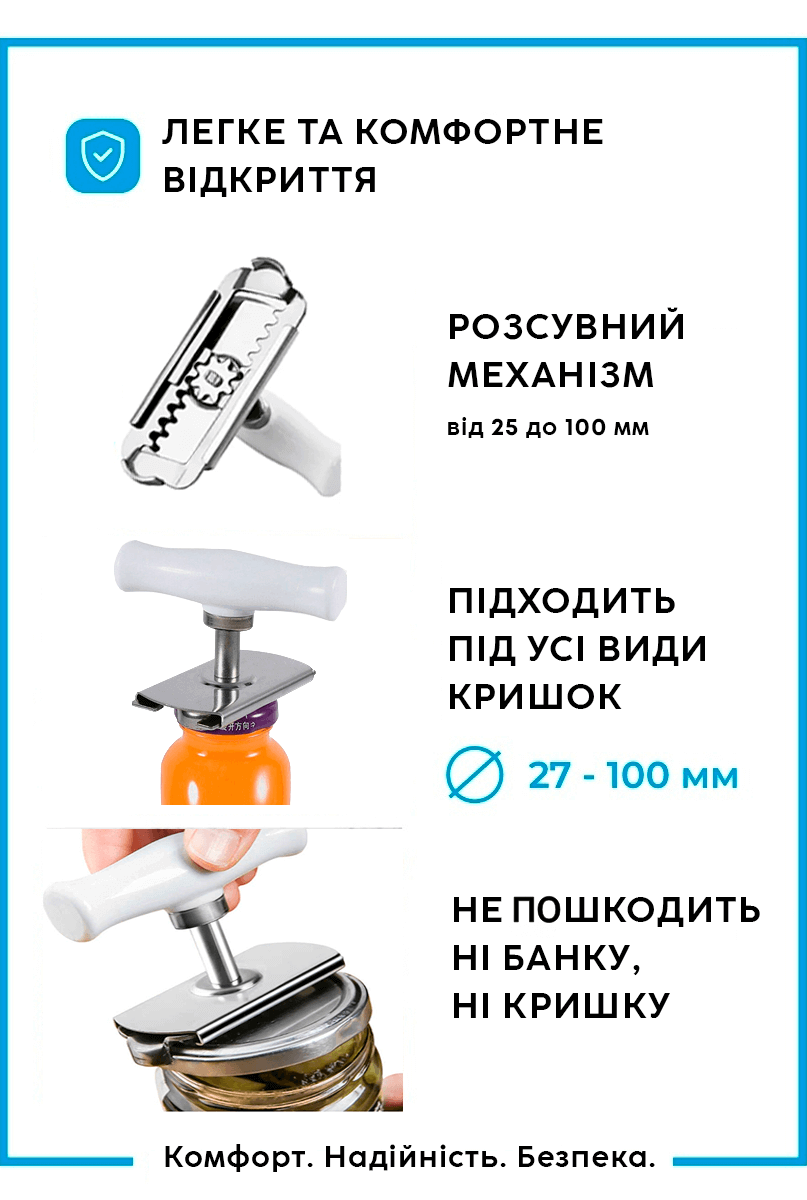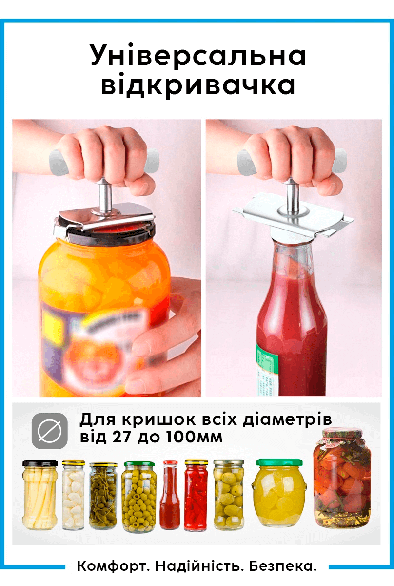 Універсальна відкривачка кришок легко допоможе відкрити будь-яку банку! Відкривачка для банок (відкривачка для скляних банок) виготовлена з нержавіючої сталі. Пристроєм неможливо пошкодити ні банку, ні кришку! Універсальний ключ для кришок скляних банок впорається з кришками діаметром - 38, - 43, - 48, - 53, - 58, - 63, - 66, - 70, - 82, - 89, - 100. Перевагою цієї відкривачки є захоплення декількох розмірів кришок, ефективність та легкість у використанні, просте зберігання. Відкривачка для кришок виготовлена з нержавіючої сталі має стильний зовнішній вигляд. Це ідеальний пристрій для відкриття домашніх заготовок. За допомогою пристрою можна також відкривати гвинтові пробки пляшок. Ключ для банок – ідеальний подарунок для рідних.