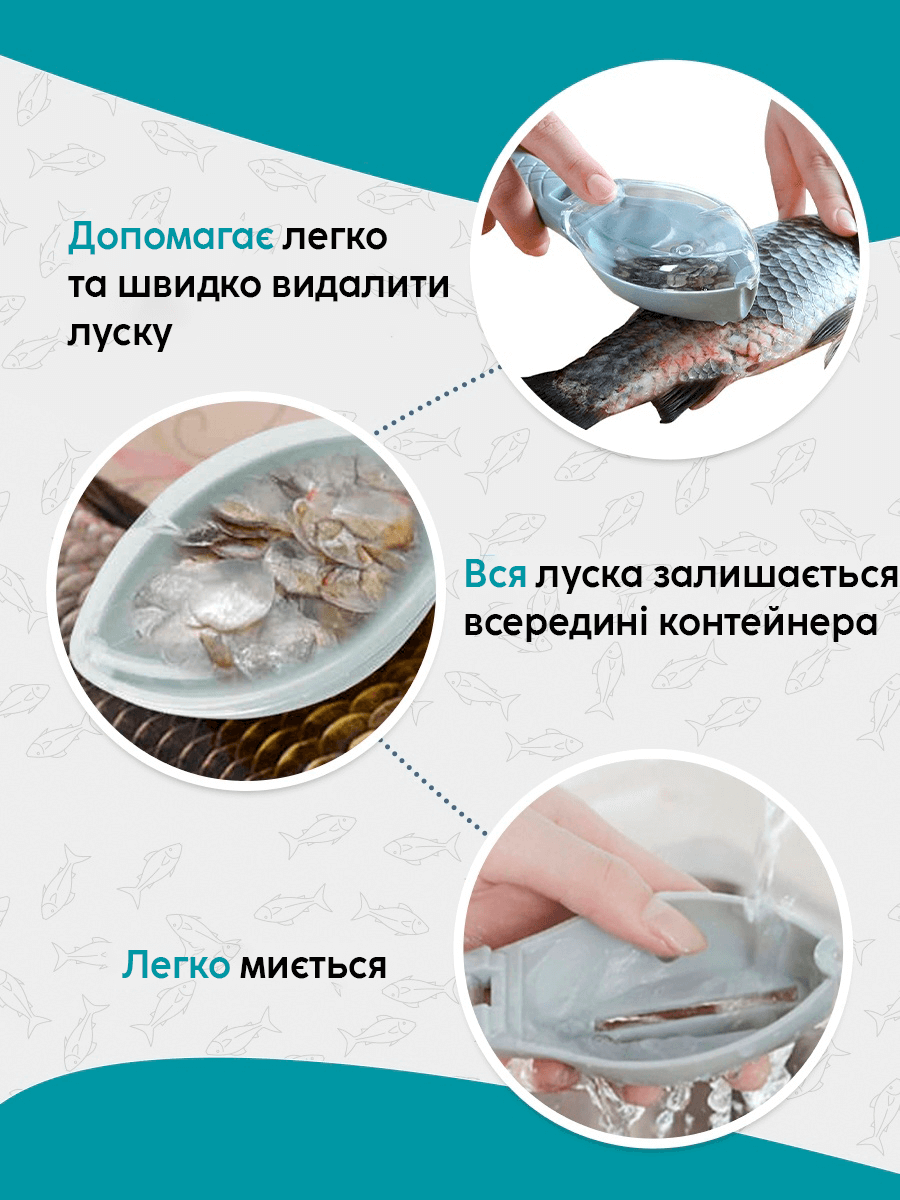 Рибочистка з контейнером (ніж для чищення риби) - сучасний кухонний девайс для безпечного та швидкого чищення риби (гаджети для кухні). Успішно справляється з чищенням різних видів риб, навіть із великою лускою! Процес очищення риби стане менш клопітким за рахунок прозорого контейнера для збирання луски, розташованого прямо на пристрої, що дозволяє відстежувати свою наповненість. В одному пристосуванні вмістився весь набір для чищення риби, що дозволяє заощадити багато часу. Невеликі габарити дозволяють використовувати, рибочистку не тільки вдома, але і на дачі, на рибалці, на пікніку і навіть на робочому місці, якщо воно пов'язане з приготуванням риби. Рибочистка з контейнером для збирання луски стане в нагоді і для рибалки, щоб взяти на риболовлю і швидко почистити рибу за допомогою пристрою. Чищення риби після рибалки стане приємнішим.
