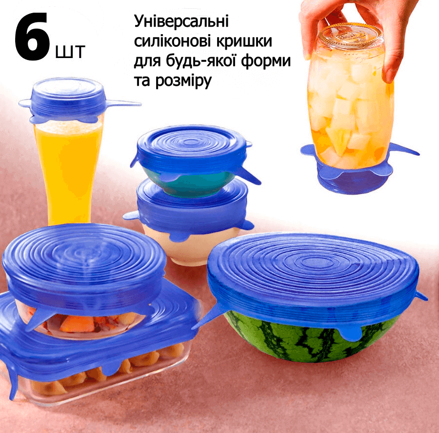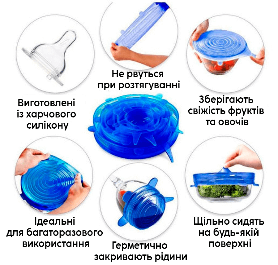Силіконові кришки, що розтягуються, можна одягати на тарілки, каструлі, банки, контейнери, а також на самі продукти, наприклад, на половинку кавуна або дині. Кришки для ємностей гладкі, міцні і досить еластичні, щоб щільно прилягати до контейнерів незвичайної форми і запобігати проливанню продуктів, зберігаючи при цьому свіжість та привабливий вид продуктів. Супи, бульйони, компоти, морси та інші рідини не проллються за жодних умов, тому що силіконові кришки для посуду щільно прилягають до будь-яких матеріалів. Ви можете використовувати силіконові кришки, що розтягуються, при температурі від -60C до 220C:-в духовці-мікрохвильовці-холодильнику. У наборі 6 еластичних кришок для посуду: 7см-10см-12см-15см-17см-20см